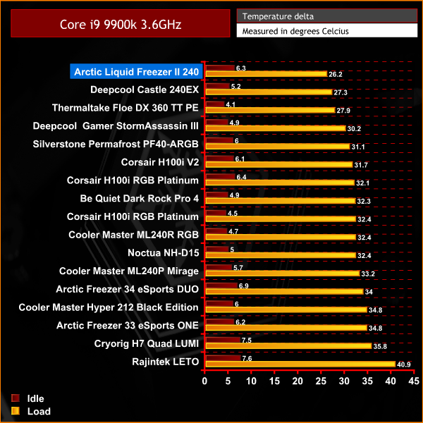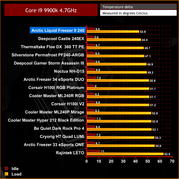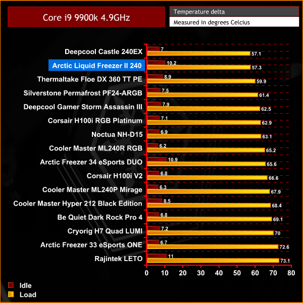 Not quite topping our charts, however, the Liquid Freezer II again performs very well with the CPU frequency at 4.9 GHz. The Core i9-9900K is a difficult CPU to keep cool which proves the Liquid Freezer II is an excellent cooler.