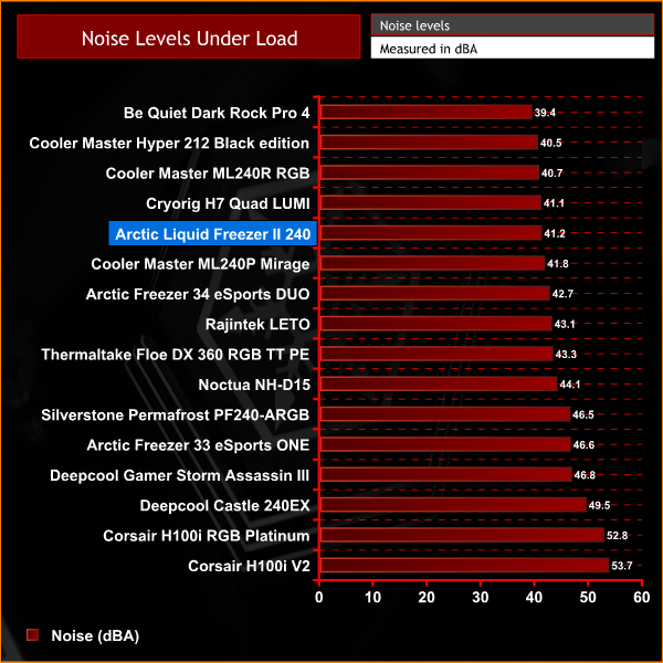 Backing up our opinion that the Arctic Liquid Freezer is an excellent cooler, is how well it did in the acoustic test. Not only can this cooler keep the temperature of the Core i9-9900K well under control, it does this while being one of the quietest coolers we have tested.