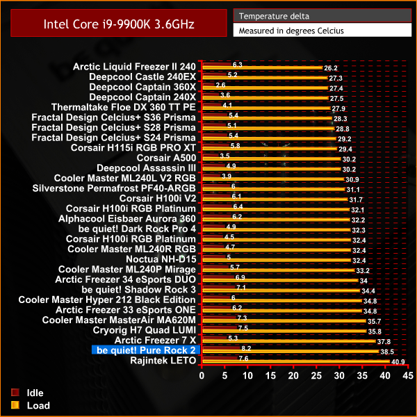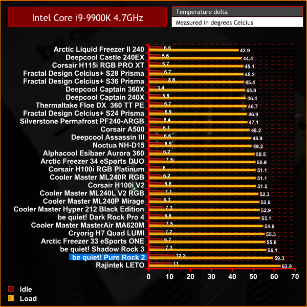 With the Intel Core i9-9900K CPU in our test bench set at its base frequency of 3.6 GHz, we were expecting the thermal performance of the Pure Rock 2 to be around a similar level to other four heat pipe coolers of a similar size, such as the Arctic Freezer 33 and the Cooler Master Hyper 212. However, the Pure Rock 2 was even outperformed by the smaller, two heat pipe Arctic Freezer 7 X which is a little disappointing.