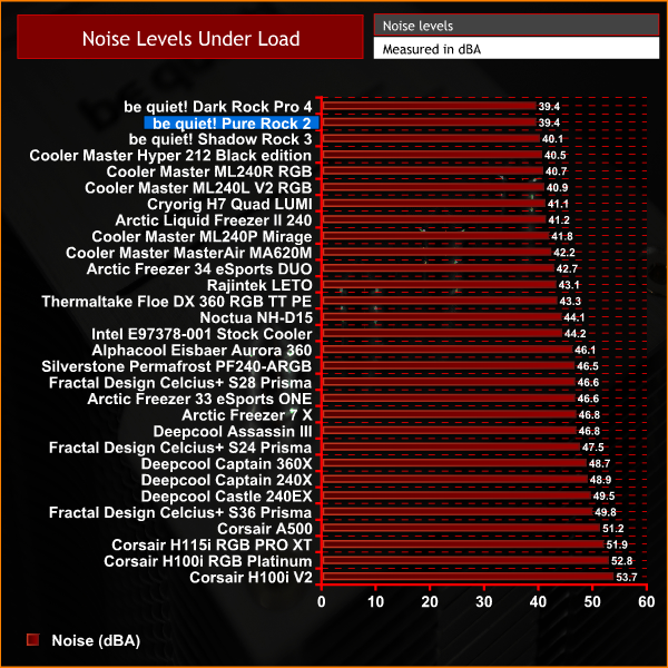 The main focus of all be quiet! CPU coolers is to achieve low noise levels, and this is one area that the Pure Rock 2 excels. As you can see from our charts, all three top spots are taken up by be quiet! coolers and this in part, explains why the thermal performance is a little disappointing.