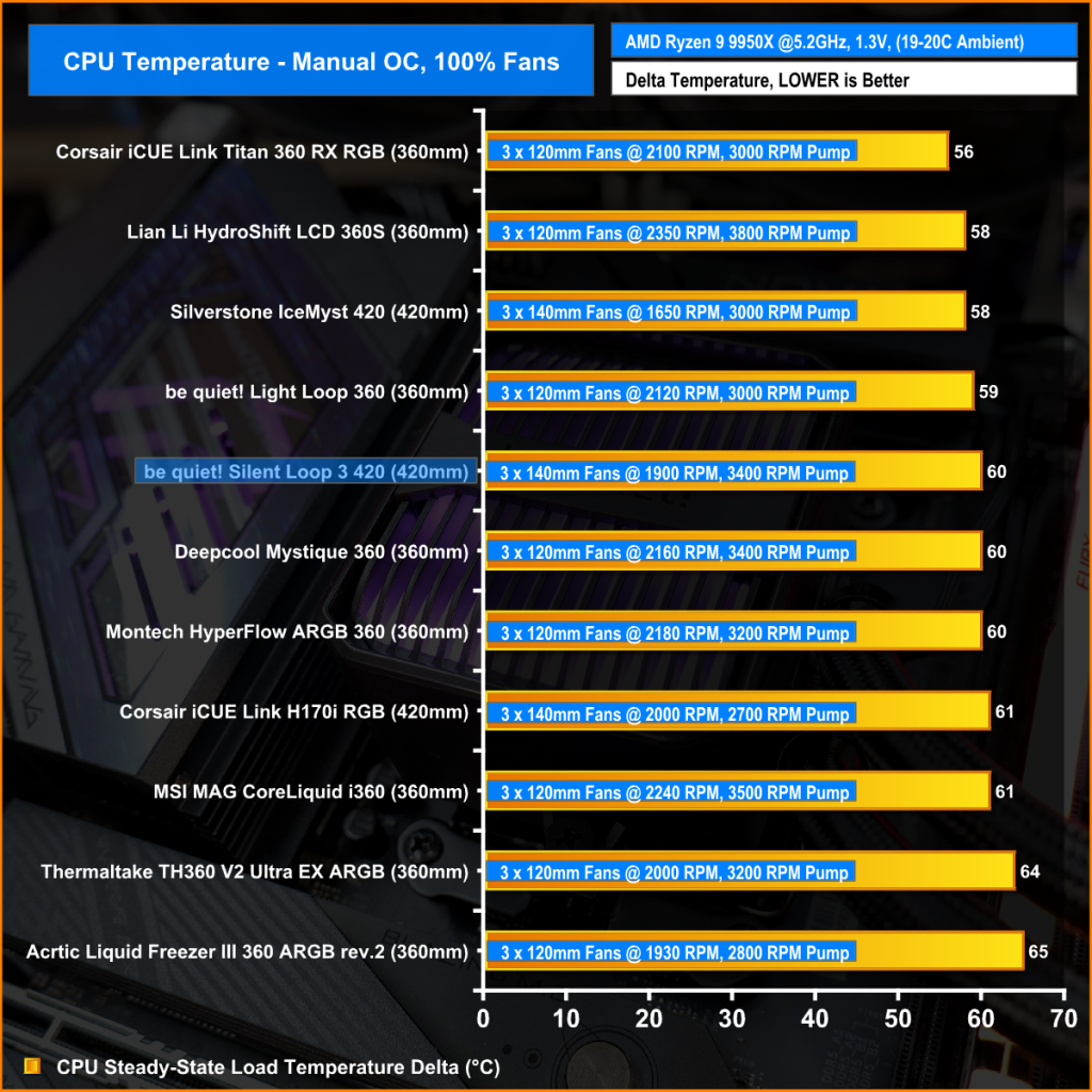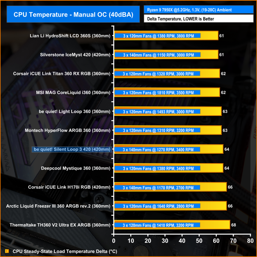 With the fans running at maximum speed at around 1900 RPM, the be quiet! Silent Loop 3 420 shows decent thermal performance at 60°C average over ambient. However, it only matches the performance of its smaller and older sibling, the be quiet! Light Loop 360. But performance is within a couple of degrees of the Silverstone Ice Myst 420 and Corsair H170i RGB, however there's a clear gap to the best in the chart.