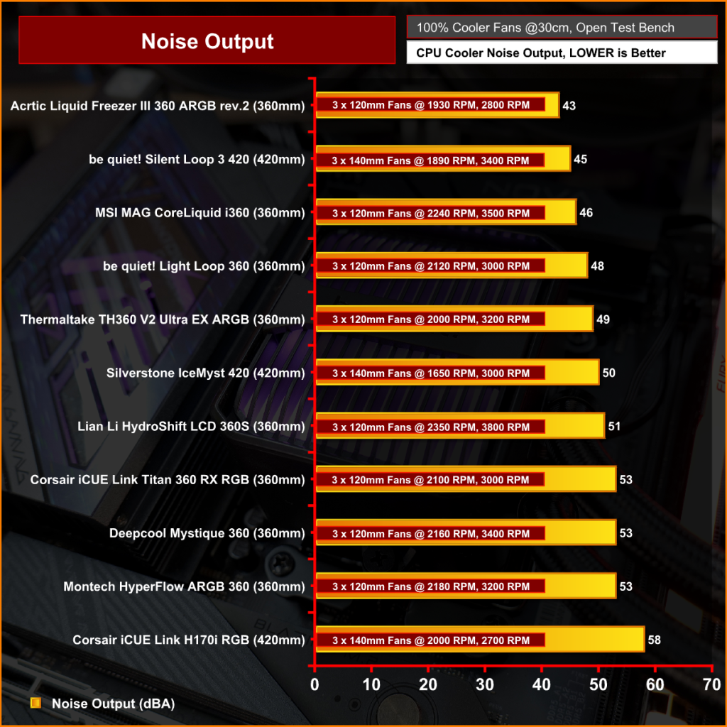 The Silent Loop 3 420 holds on to performance with fan speed reduced, but it still only matches the Light Loop 360. It’s a couple of degrees better than the Corsair H170i RGB but the Silverstone IcyMyst 420 pulls a few degrees cooler at 40dBA so the Sight Loop 3 performance is a little disappointing as it’s the newer of the 420mm AIOs in our data pool.