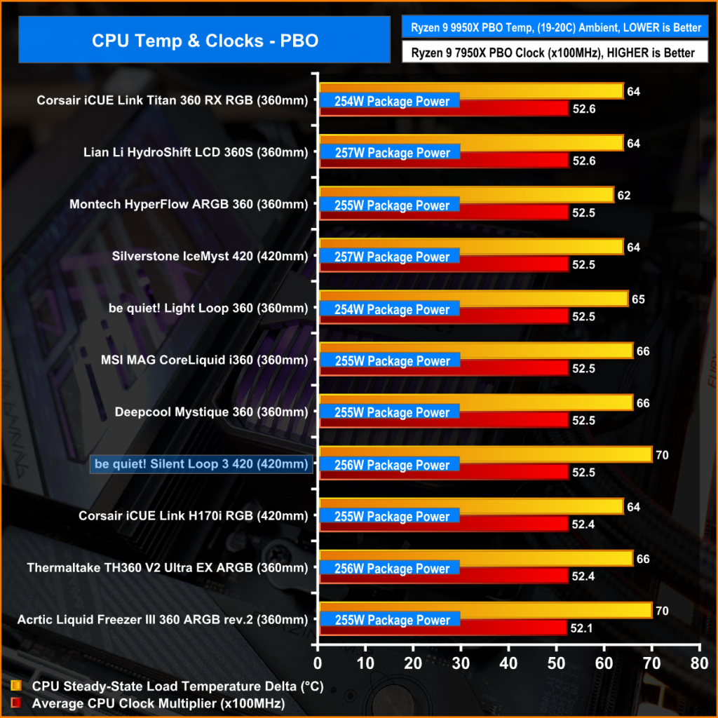 In this scenario the be quiet! Silent Loop 3 again does ok with an average clock multiplier of 52.5x at 70°C over ambient, which is a minor improvement over the 420mm Corsair unit but as we saw in the other thermal tests, it's not blistering performance and only on par with other 360mm units.