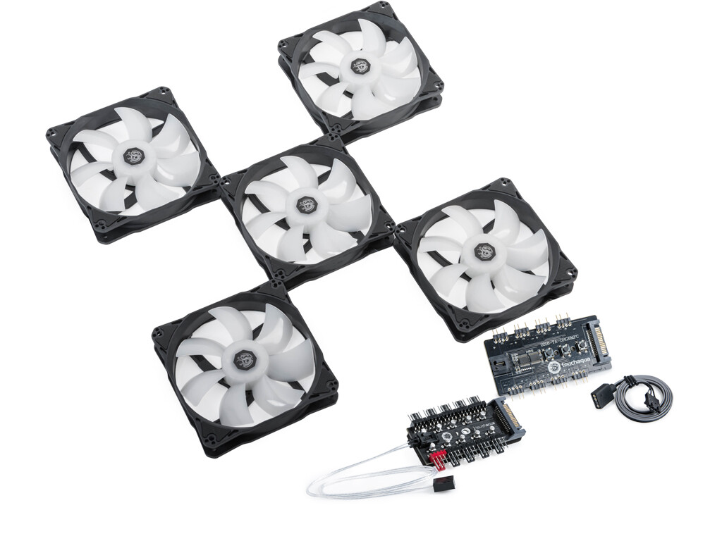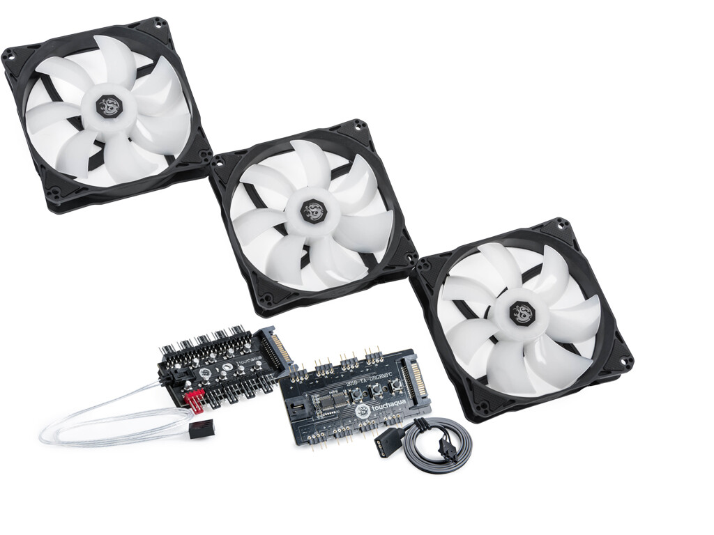 Touchaqua Notos 120 fans are available in either single quantities, as well as multi-packs of three pieces or five. Multipack kits included a BPTA-DRGBMFC lighting controller that is powered by a SATA power connector and features onboard buttons to control RGB lighting colours and patterns. Also included in the multi-packs is a Bitspower BPTA-PFANMFH fan-controller module featuring 10 PWM fan headers.