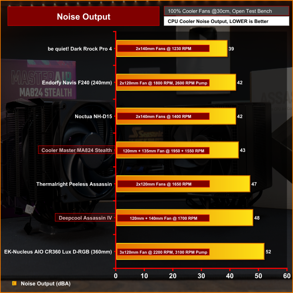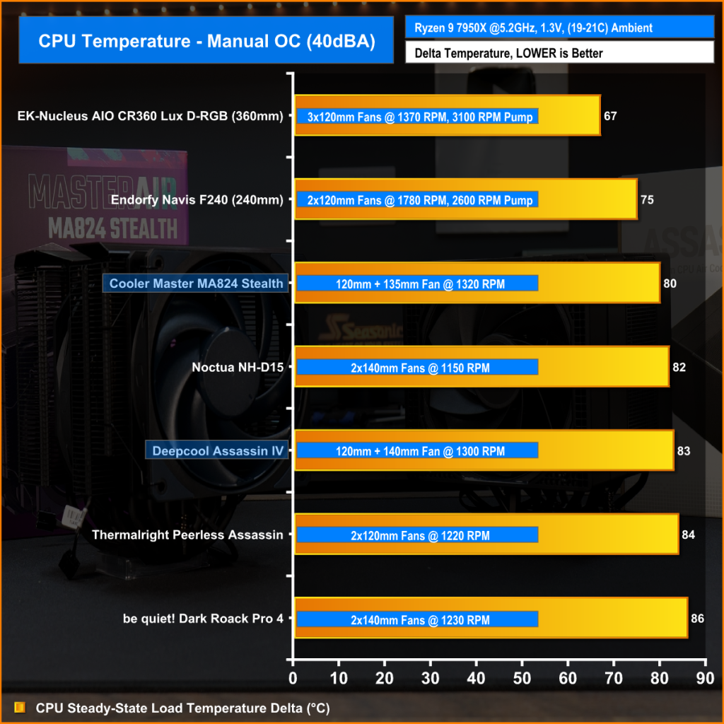 Tuning the fans down to 40dba noise output means the Assassin IV and MA824 Stealth fan speed is reduced to around 1300 RPM. At this lower noise output, the Cooler Master MA824 Stealth does a better job of holding on to the thermal performance compared with the Assassin IV. It outperforms both the Noctua NH-D15 by 2°C and the DeepCool Assassin IV by even more, so the additional heat pipe and better fans seem to be working well for the MA824 Stealth.