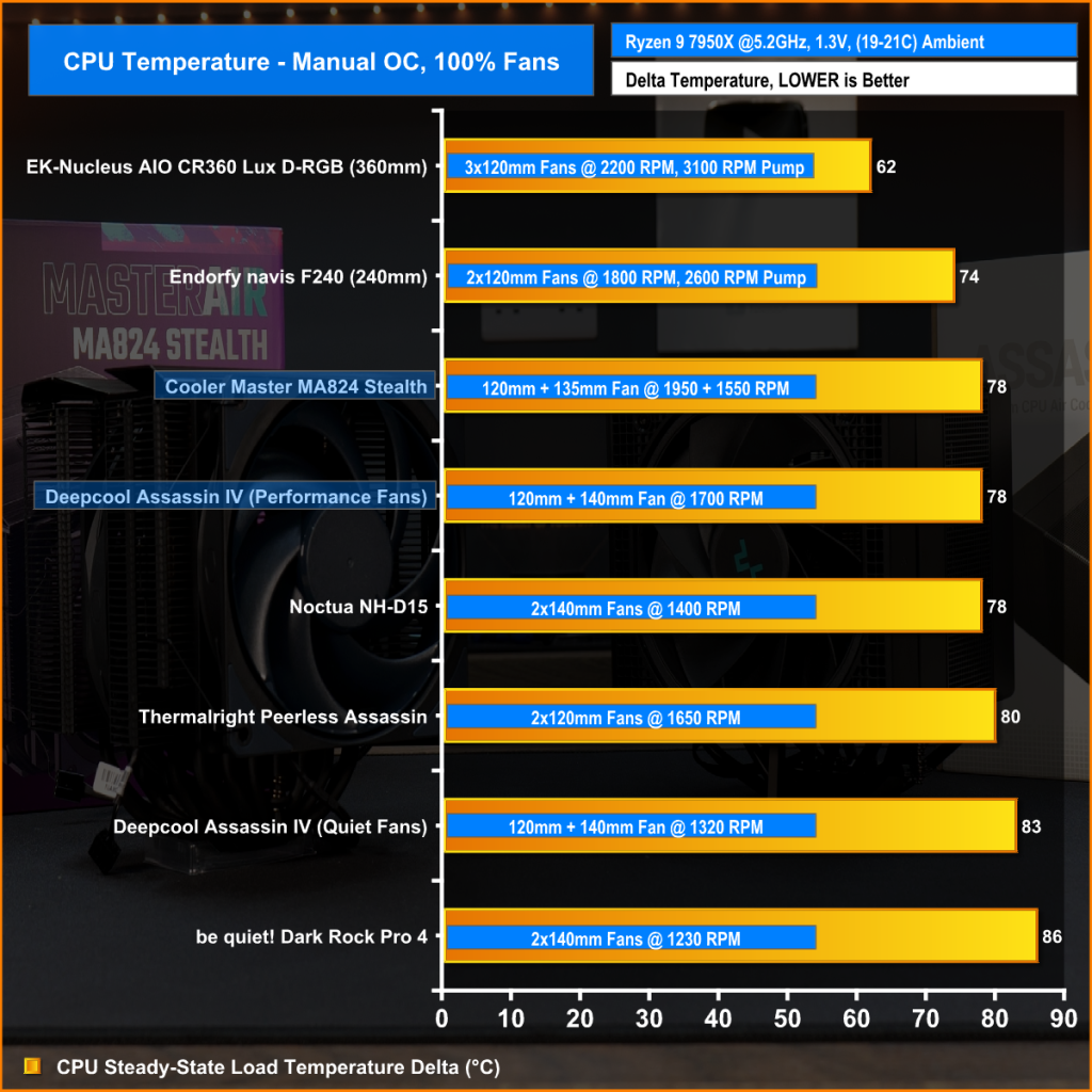 With fans at maximum RPM, the thermal performance of the MA824 Stealth and Assassin IV (in performance fan mode) are identical, with both coolers producing an average delta temperature of 78°C. The Noctua NH-D15 is also tied at max fan speed, the cheaper Thermalright Peerless Assassin isn’t far behind at just a couple of degrees higher average delta but the ageing be quiet! Dark Rock Pro 4 is easily outperformed by both coolers.