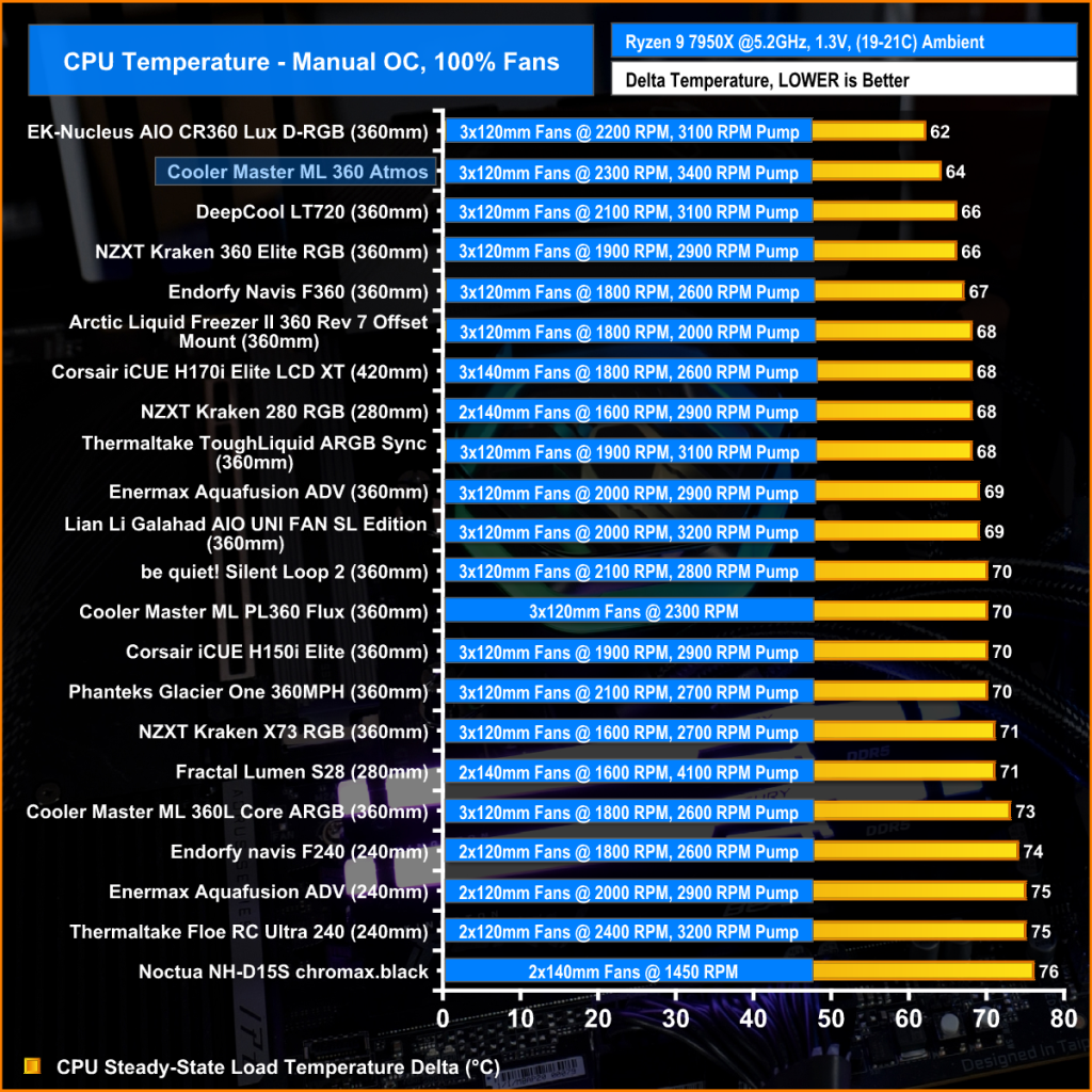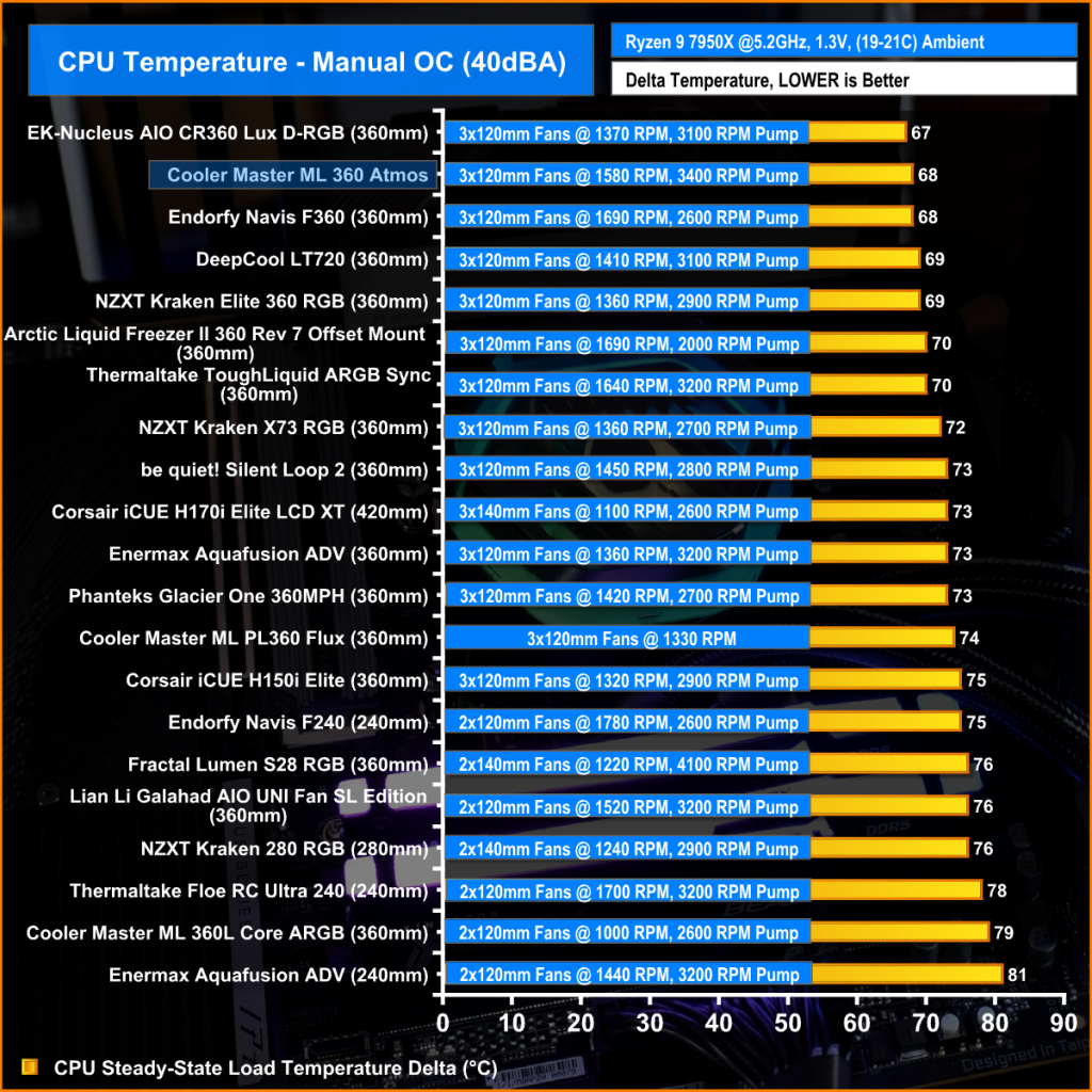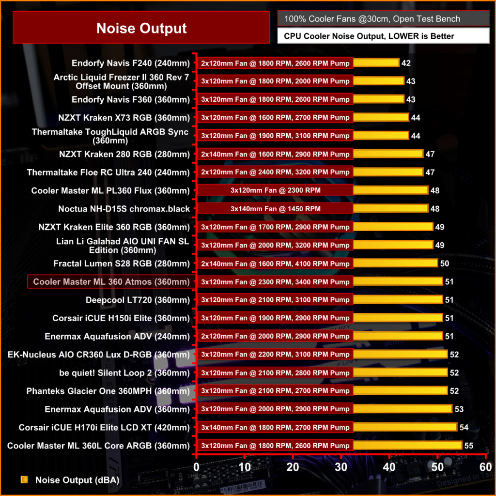 To tune the fans down to 40 dBA operation the speed had to be reduced to just under 1600RPM, which brought the Atoms even closer to the EK-Nucleus performance and if you look down the chart where the previous Cooler Master PL360 Flux is you can see a huge improvement in thermal performance for the Atmos compared to the older model, which is even more impressive.