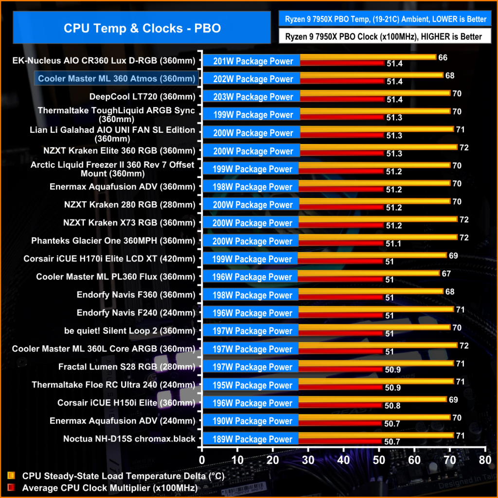 The important metric in the PBO test is the CPU clock multiplier. The Atmos was able to hold on to an average 51.4 X CPU clock multiplier while cooling 202W of package power with an average 68°C delta temperature, which means again it is sitting pretty in 2nd place and giving similar CPU performance as the EK-Nucleus in first place which is an all-round excellent result for Cooler Master.