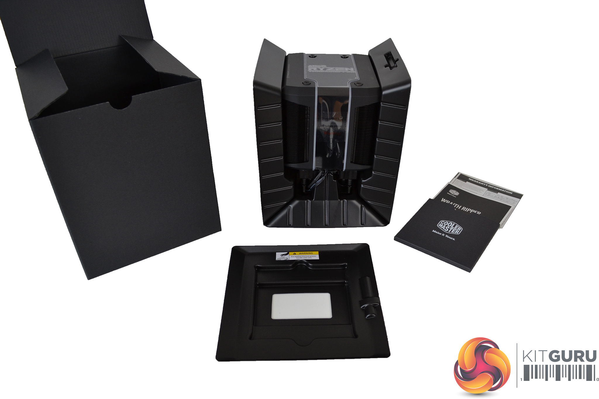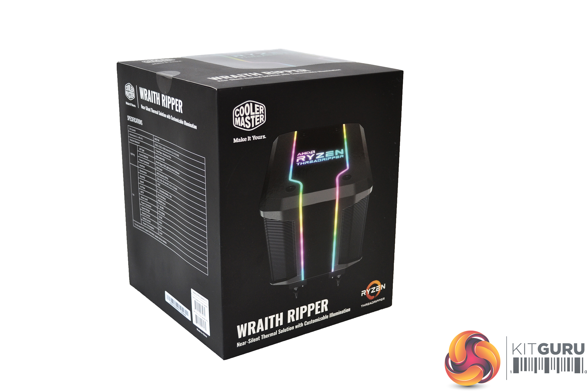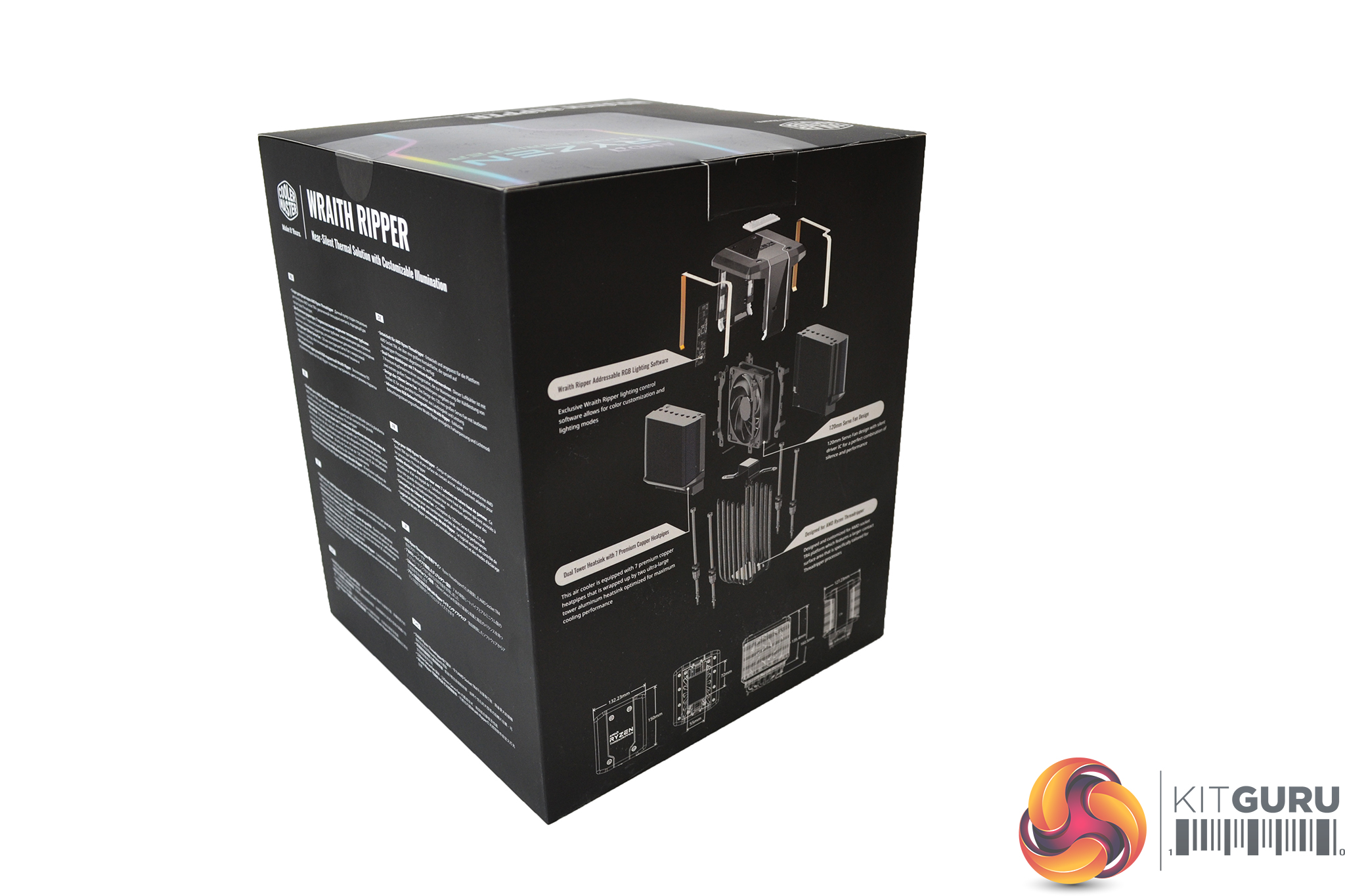 The Wraith Ripper arrives in a thin, black cardboard box. On the front, a large image of the cooler takes up most of the real estate, and on the rear we find an exploded diagram showing all the component parts of the cooler.