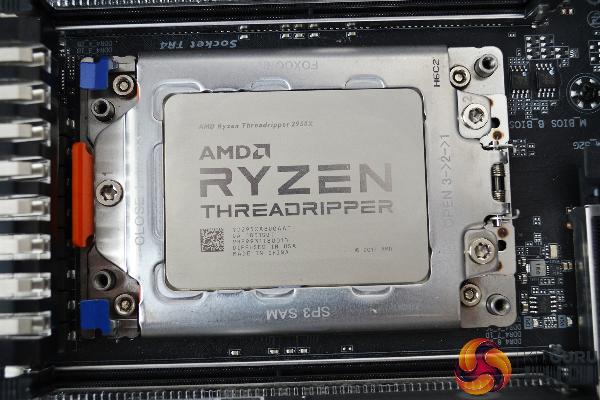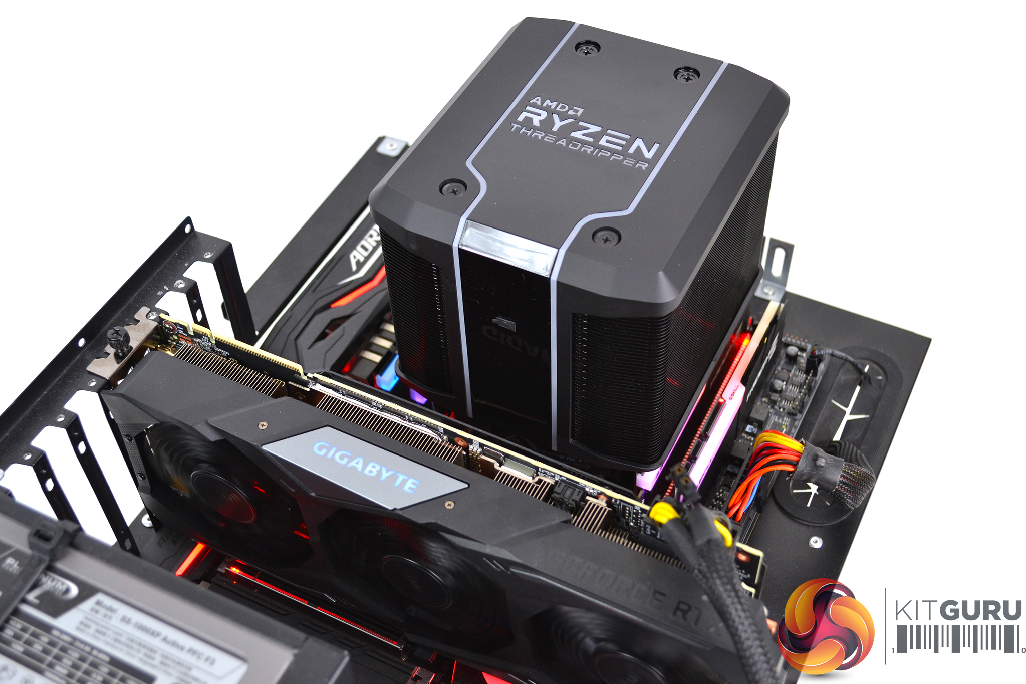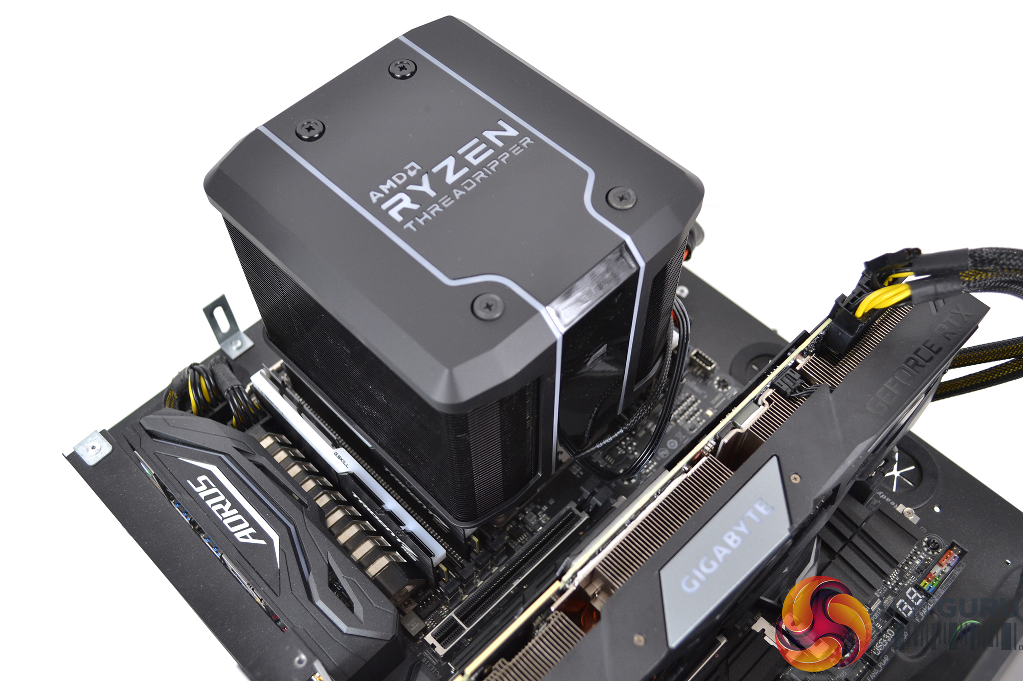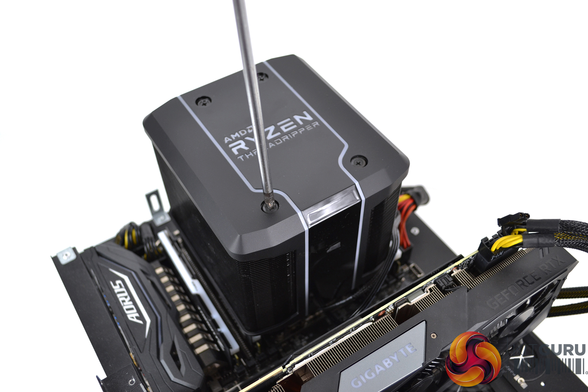 Looking at the CPU socket with the GPU below, the AMD Ryzen Threadripper logo on the Wraith Ripper should be the correct way up. If not, rotate it 180 degrees, lower it into position and engage the four screws in the socket mounting holes.