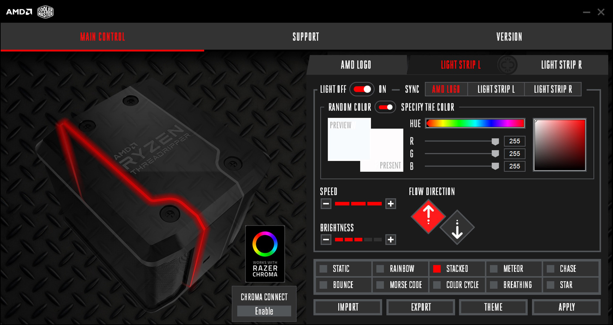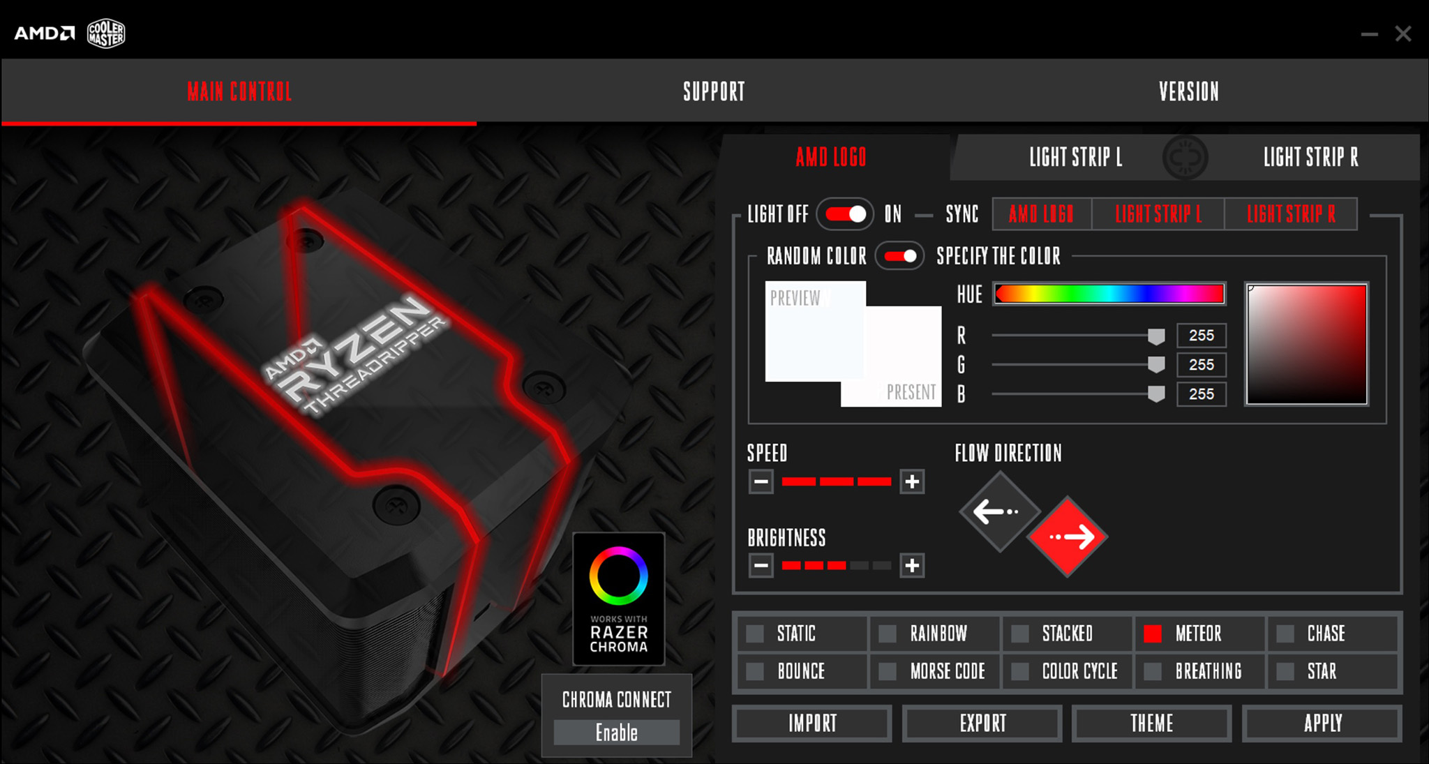 Once installed, there are multiple options. The software splits the coolers RGB lighting up into three areas – the AMD Threadripper logo, light strip L and light strip R. All three areas can be configured individually or in sync.
