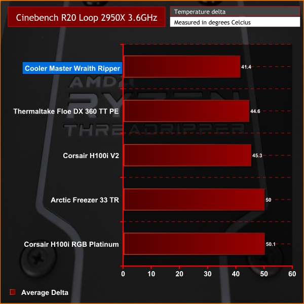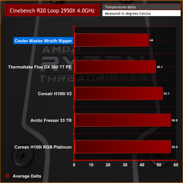 As we saw in our earlier tests, the Wraith Ripper considerably outperforms the other coolers tested, easily outperforming both the adapted Asetek 240mm and 360mm AIO coolers.