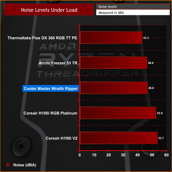 In the noise levels test, the Wraith Ripper is one of the louder coolers on our chart, but with noise levels peaking at 46.8 dBA it is still not too distracting.