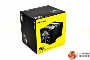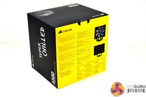 The Corsair A500 cooler arrives packaged inside a thin cardboard box, sporting the traditional Corsair yellow and black colour scheme. On the front of the packaging is a large glossy image of the cooler with Corsair and A500 printed in the top and bottom corners. On the rear, key features and specifications are listed along with images of the cooler, with detailed dimensions included.