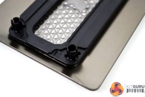 The base plate comes with mounting brackets pre-installed, as well as a pre-applied coating of Corsair XTM50 thermal compound in a grid pattern. With the thermal compound removed, we can see the base plate has a machined finish. There are some small ridges where the heat pipes join – this should fill in with thermal compound and will hopefully not adversely affect thermal transfer performance.
