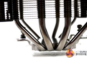 With the fans removed completely, we can get a closer look at the heatsink design. The heatsink fins are manufactured out of aluminium and are finished in a dark silver anodised effect. We can see the size difference between the inner and outer heat pipes which also sport the same anodised finish, which continues onto the thermal transfer base plate.