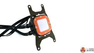 Next, lower the pump down over the CPU and align with the mounting posts. Take the four thumbscrews and tighten in an X pattern to evenly spread pressure on the CPU HIS. Final tightening can be finished off with a screwdriver if necessary.