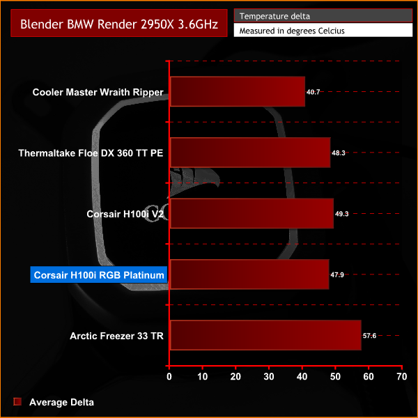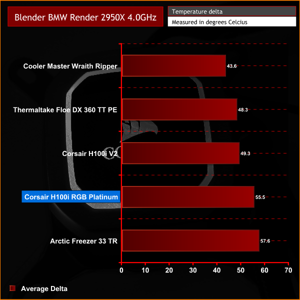 As we saw in the AIDA64 tests, the H100i RGB Platinum struggles to keep the temperatures of our 2950X under control, although it is still within a workable range. Again, things are a little disappointing here as it is only just out-performing the much cheaper Arctic Freezer 33 TR when overclocked.