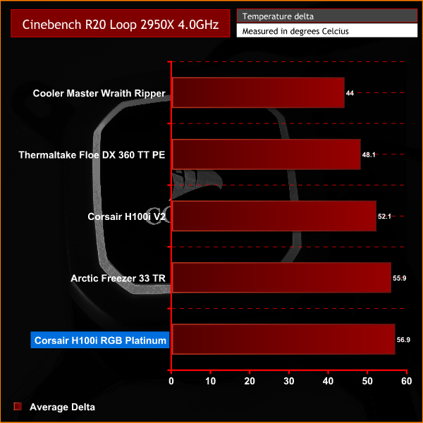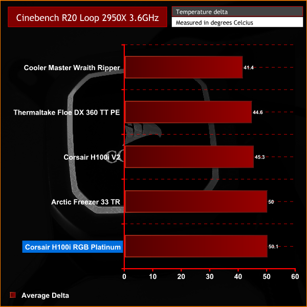 Continuing the theme in thermal performance tests, the H100i RGB Platinum does not perform well and is bottom of the list in our Cinebench R20 Tests. When the CPU is overclocked, the H100i RGB Platinum really struggles with thermal dissipation. Again, the much cheaper Freezer 33 TR does a slightly better job.