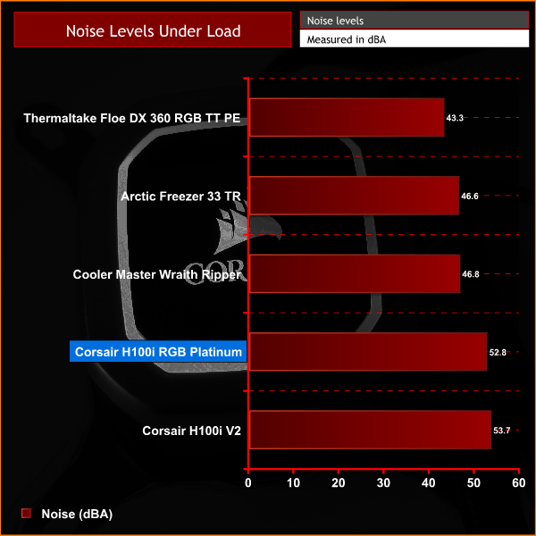 In our noise levels test the H100I RGB Platinum is one of the loudest coolers we have tested so far. This isn't a surprise as the Corsair fans are notoriously loud due to their 2700 RPM speeds.
