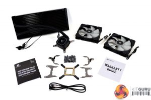 Inside the box is an additional layer of protective cardboard packaging along with two Corsair ML140 fans, mounting hardware for Intel and AMD platforms including TR4/TRX40, a USB cable with motherboard header connection, an installation manual, warranty booklet and of course, the cooler itself.