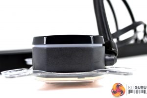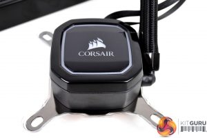 The pump housing is primarily constructed out of a black plastic material with an upper glossy finish and a lower section with a matt finish. The top of the pump housing includes a Corsair logo that lights up in RGB colour and around the perimeter is an opaque plastic strip that also is illuminated in RGB.