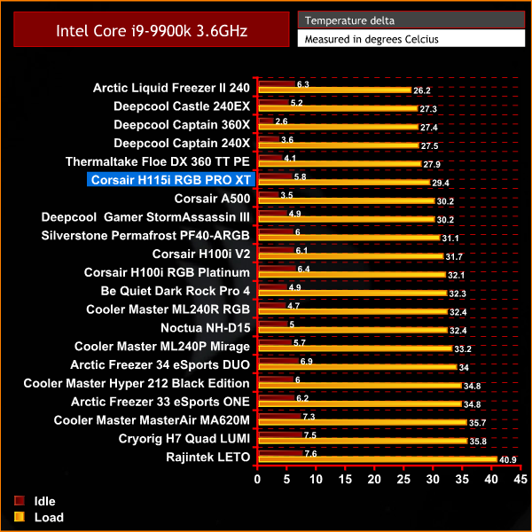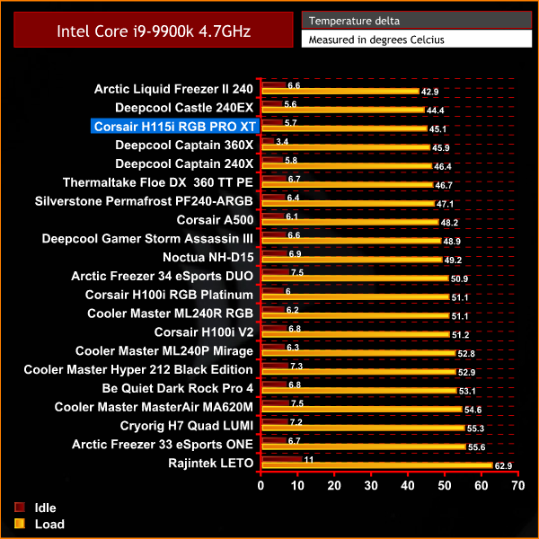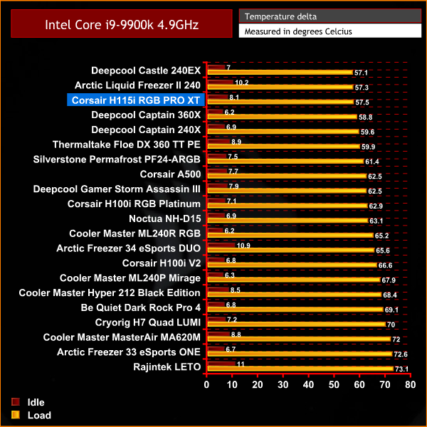 During our final thermal performance test with the Intel Core i9-9900K locked at 4.9GHz across all cores, the Corsair H115i RGB PRO XT continues its excellent thermal performance and holds on to third place in our chart, which is an excellent achievement.