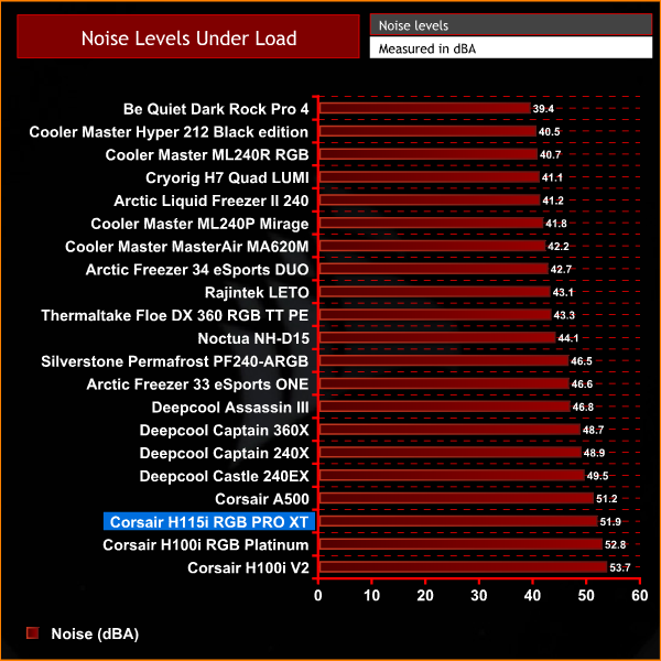 One of the main factors why the Corsair H115i RGB PRO XT performs so well is the 2000RPM speed at which the ML140 fans operate at full load. However, this does contribute to high noise levels which could prove to be quite distracting for some users. The H115i RGB PRO XT is one of the loudest coolers we have tested.
