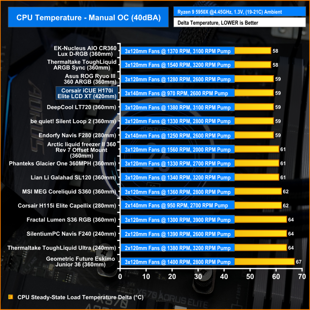 With noise output normalised and limited to 40dBA the H170i Elite LCD XT holds on to its cooling performance and is still up at the top of the chart, but again we see it only performing on par with some of the best 360mm coolers. This again is a good result but a little disappointing considering that this cooler has an increased cooling surface area.