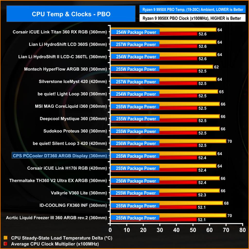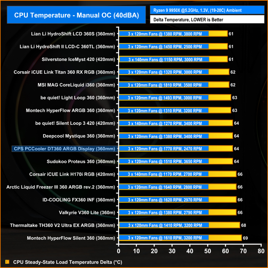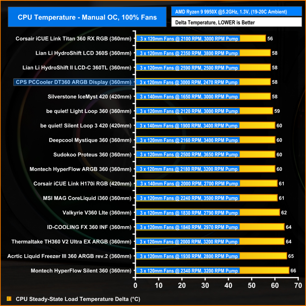 This drops the performance to mid-table, similar performance as the Deepcool Mystique 360 and the be quiet! Silent Loop 3 420 at 64°C over ambient, which again is only a few degrees off the top coolers, so it's solid performance from the PCCooler DT360 AIO.