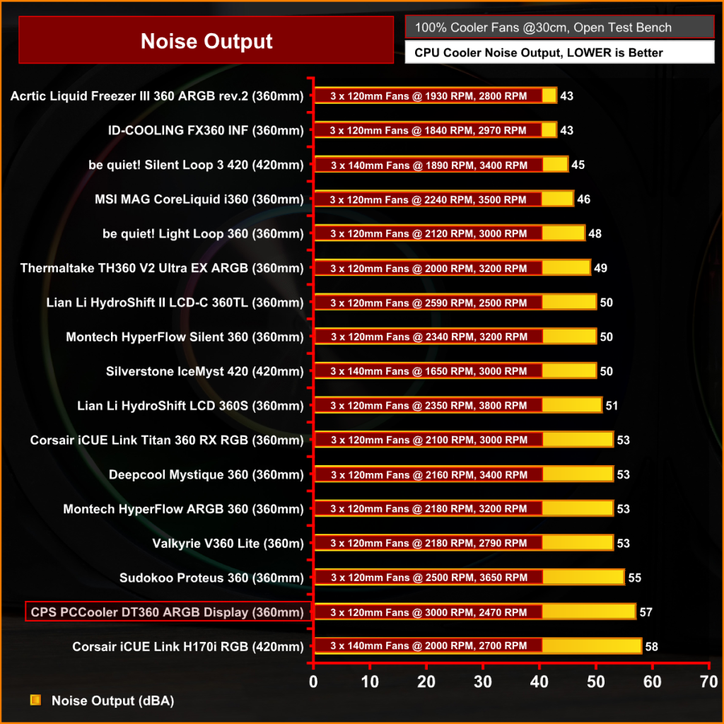 AT 57dBA the CPS PCCooler DT360 ARGB display is loud but the fans are running at very high speed, so this high noise output is to be expected, but you wouldn’t want to run the cooler at this fan speed if you care about noise at all.