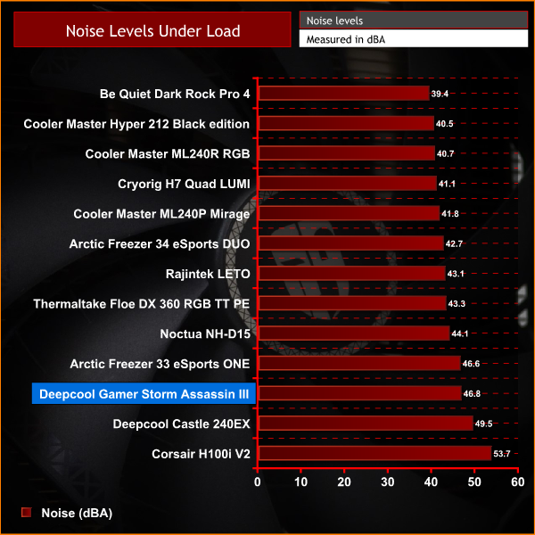 In our noise level test, the Assassin III was measured at 46.8 dBA, which is towards the higher end of the scale – over 2 dBA louder than its competitor, the NH-D15.