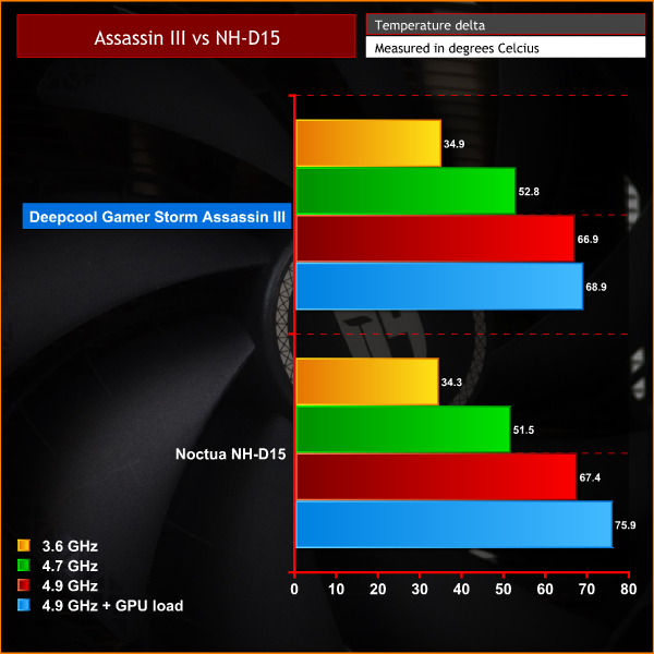 As we can see from the data above, initially the NH-D15 outperformed the Assassin III. When higher clock speeds and GPU load was introduced, the Assassin III improved and eventually beat the NH-D15 by a considerable margin.