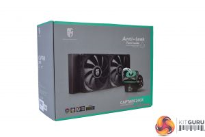 Deepcool has continued with its familiar grey and green theme for the packaging of the Captain 240X. The front of the box sports a large central image of the cooler with references to the Anti-leak technology and compatible RGB sync software in opposite corners. On the rear is a list of key features with diagrams and technical specifications listed too.