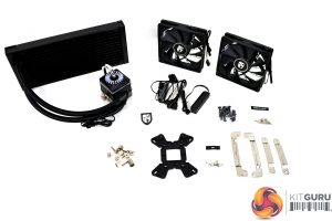 Once everything has been removed from the packaging, we can get a better idea of exactly what is included. Two TF120 S fans, a PWM hub, RGB controller, mounting hardware for both Intel and AMD platforms, along with a Gamer Storm self-adhesive emblem and the cooler itself are in the box.