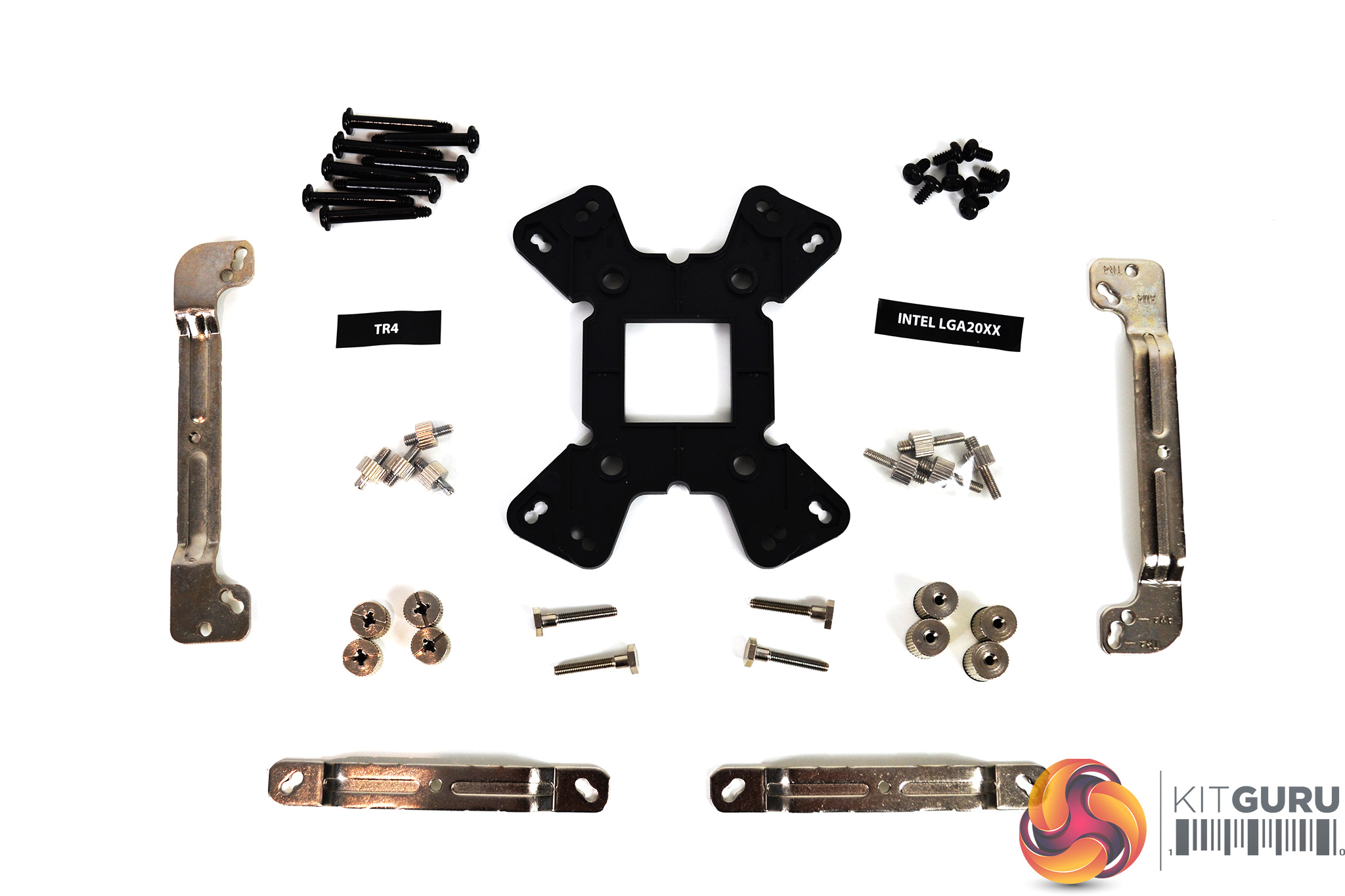 All the mounting hardware is sorted into separate bags with labels to indicate what platform they are for. A plastic universal backplate is supplied for use with Intel and AMD mounting hardware. Both Intel socket 20XX and AMD TR4 have their own specific standoff mounts which are supplied in the box too.