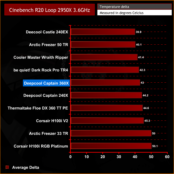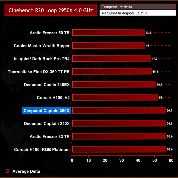 During our Cinebench tests, Captain 360X came out with pretty much the same results as in other tests. It managed to continue outperforming its smaller sibling, the Captain 240X but was well beaten by the closest 360mm rival and the Castle 240EX.