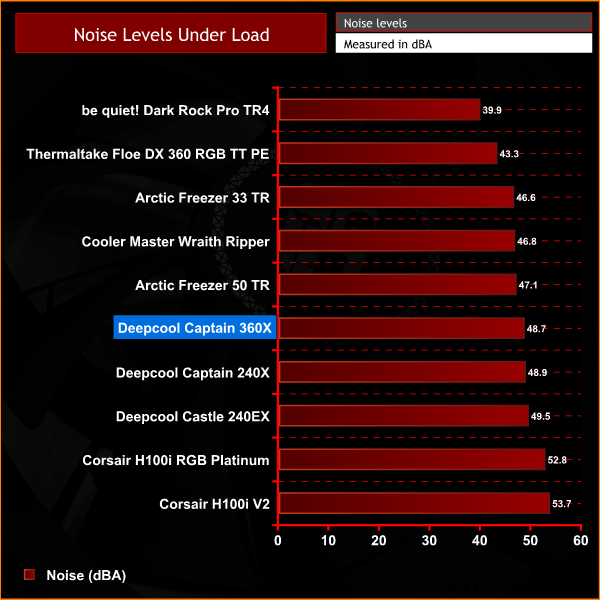 There are no big surprises in our acoustics testing – the Captain 360X produces around the same noise levels as the other Deepcool coolers that use the same TF 120 S fans in our chart. The Captain 360X is on the high side when it comes to noise output, however, it's not overly distracting.