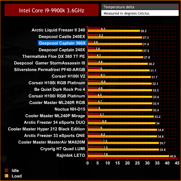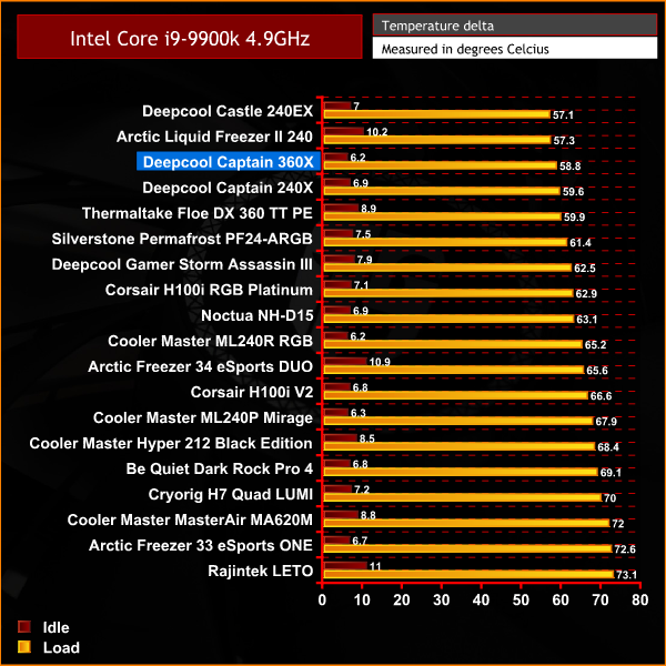 In our Intel Core i9-9900K thermal test, the Deepcool Captain 360X does a good job of keeping the temperature under control at both stock 3.6 GHz and 4.9 GHz overclocked frequencies. However, it is only a very slight improvement over its smaller sibling, the Captain 240X and is beaten by the Castle 240EX once again.
