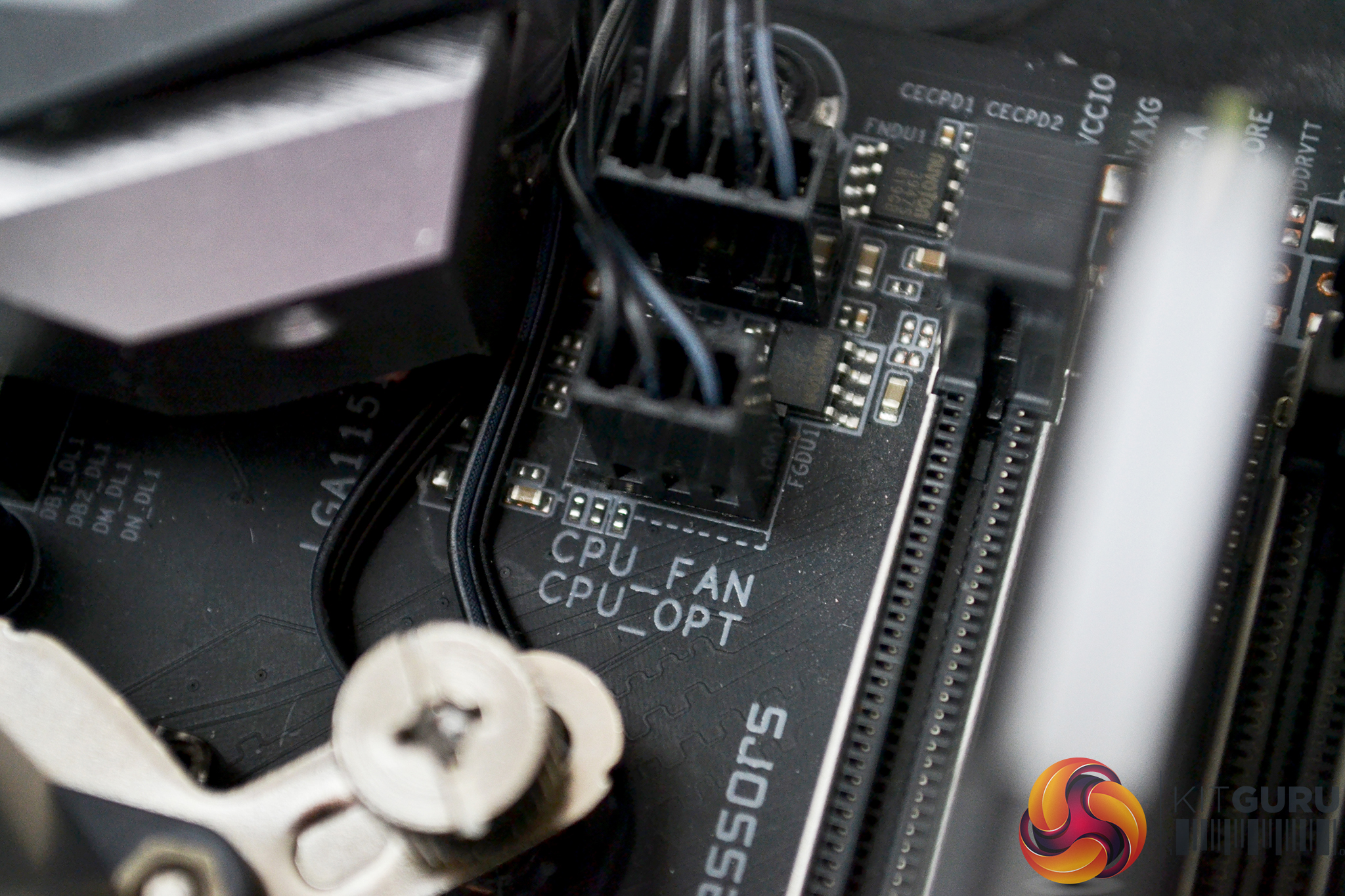 To complete the installation the cables need connecting next. The fans are connected together using the included 4-pin PWM splitter cable and then connected to the motherboard CPU_FAN header. The 3-pin pump power cable connects to the CPU_OPT header on our Gigabyte Z390 Aorus Xtreme motherboard.