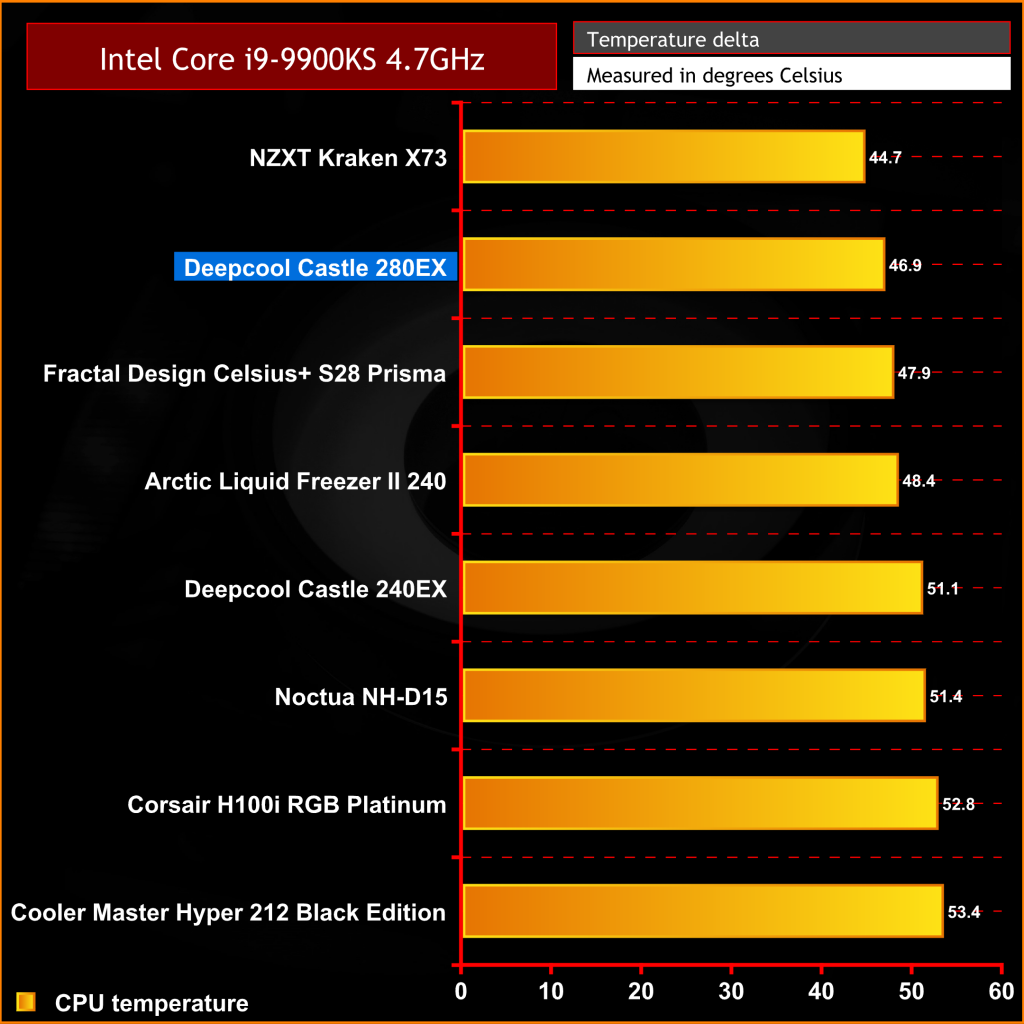 In terms of raw thermal performance with the pump and fan speed running at maximum RPM, the Deepcool Castle 280EX performs very well. It produces similar thermal performance to other closed-loop coolers of its size and offers a slight improvement in performance over its smaller brother, the Castle 240EX. Even with the Intel Core i9-9900KS running at an all-core frequency of 5.1 GHz, the Castle 280EX shows it is capable of handling the heat output of a high-end overclocked CPU.
