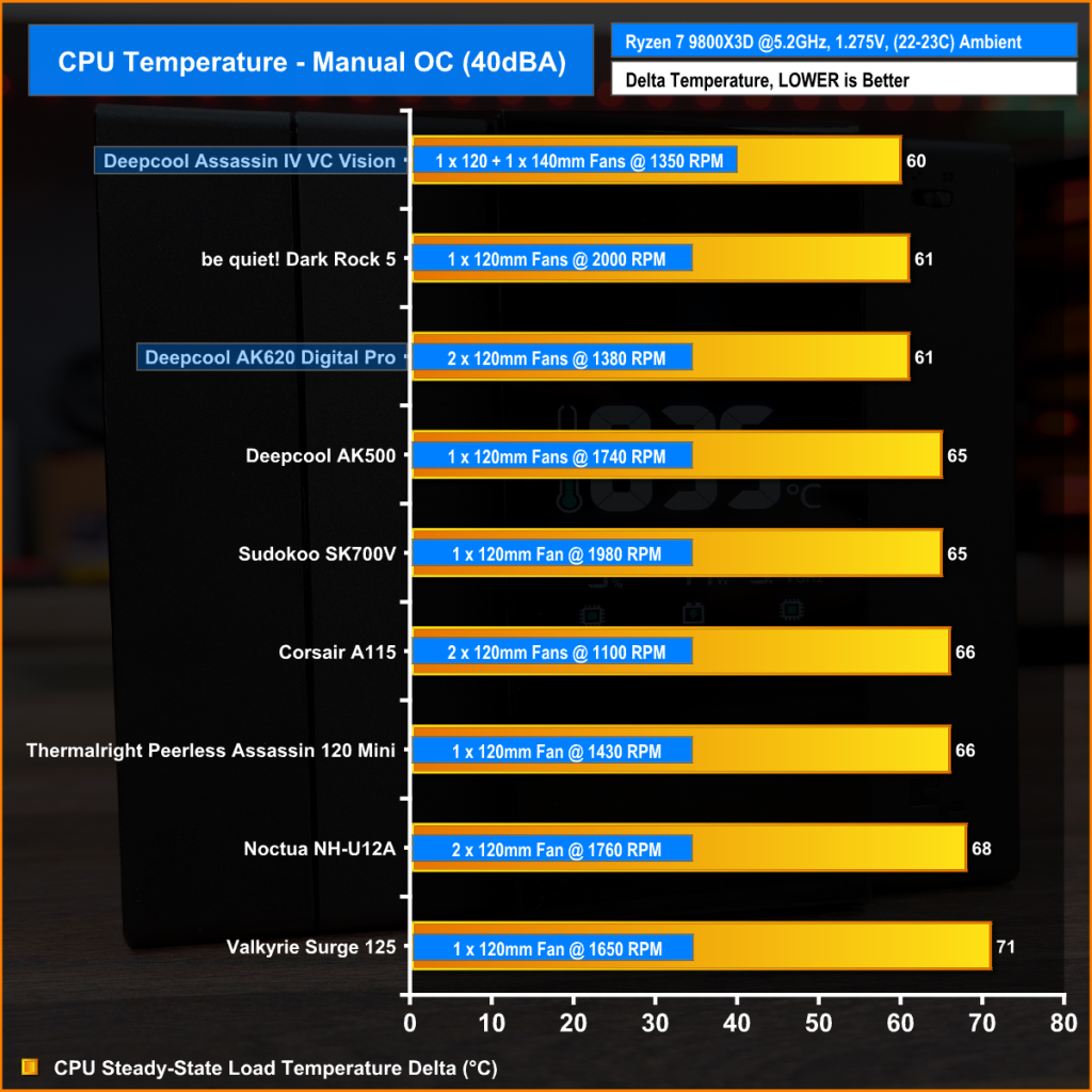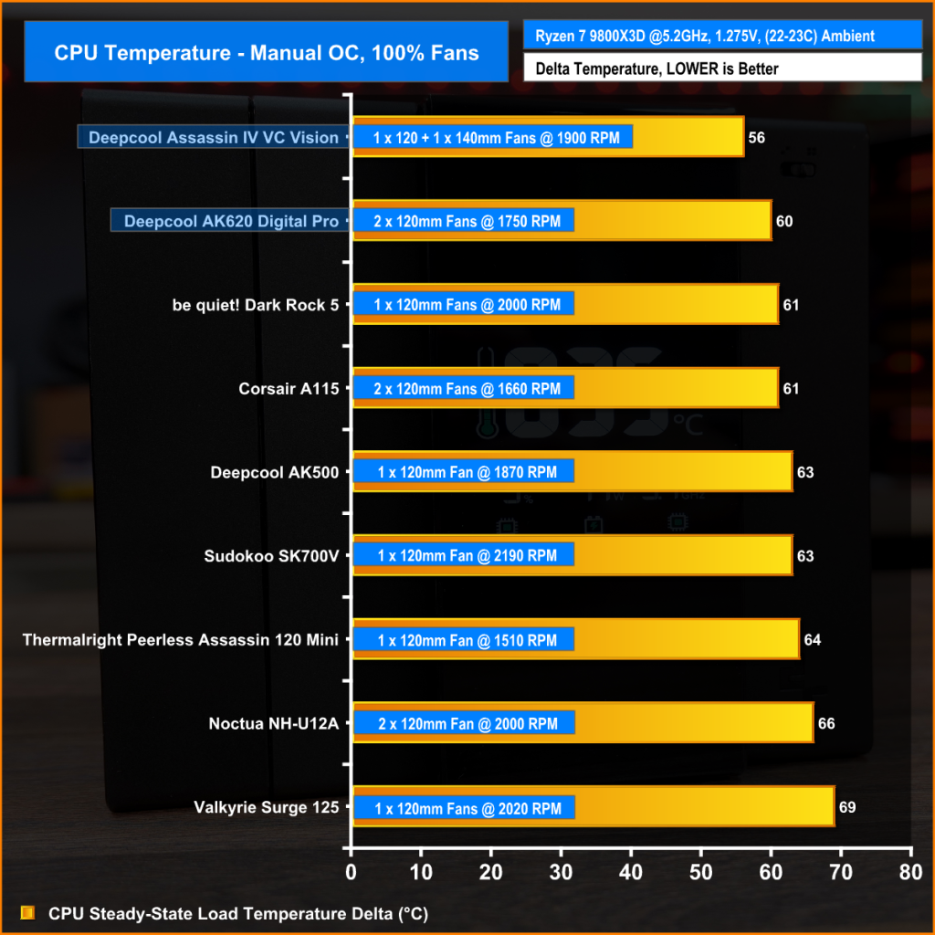 Straight away we can see the advantage in terms of raw thermal performance that the Assassin IV VC has over the competition, with fans maxed out the Assassin IV VC Vision is 4°C cooler than the next best competitor, the AK620 Digital Pro, which is excellent considering the Assassin IV VC Vision is the quieter of the two at max fan speed.
