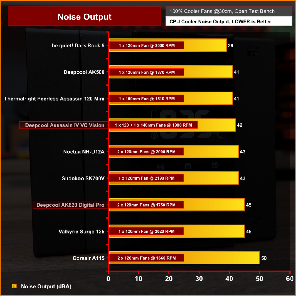 In terms of noise output, the better choice of the two coolers on test today is the Assassin IV VC Vision, as it is running 3 dBA quieter than the AK620 Digital Pro at max fan speed. Neither cooler can match the ultra-low noise output of the be quiet! Dark Rock 5 though, but this only uses a single fan so it has the advantage here.
