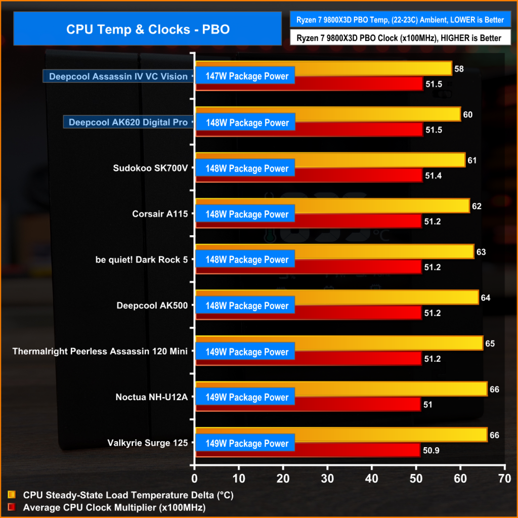 In the PBO test both the Assassin IV VC Vision and the AK620 Digital Pro perform very well. They both manage a clock multiplier of 51.5x which is the highest we have recorded on the Ryzen 7 9800X3D so far, narrowly beating the Sudokoo SK700V. So with either of these coolers you will get great AMD PBO performance, but the better value comes from the AK620 Digital Pro.