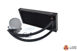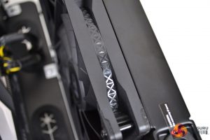 On further inspection of the cooler, we can see at the top corner of the radiator, where the anti-leak bag is located, a caution stick has been applied. Dimensions of the radiator are 282mm long, 120mm wide and 27mm deep without fans fitted – so 53mm deep with fans installed. The radiator is constructed from aluminium with a high-quality satin black finish.