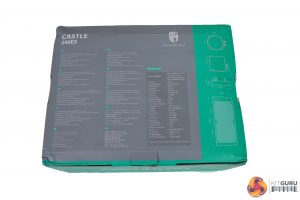 Highlighted on the rear of the box are key features and specifications, accompanied by a diagram, showing dimensions to the right.