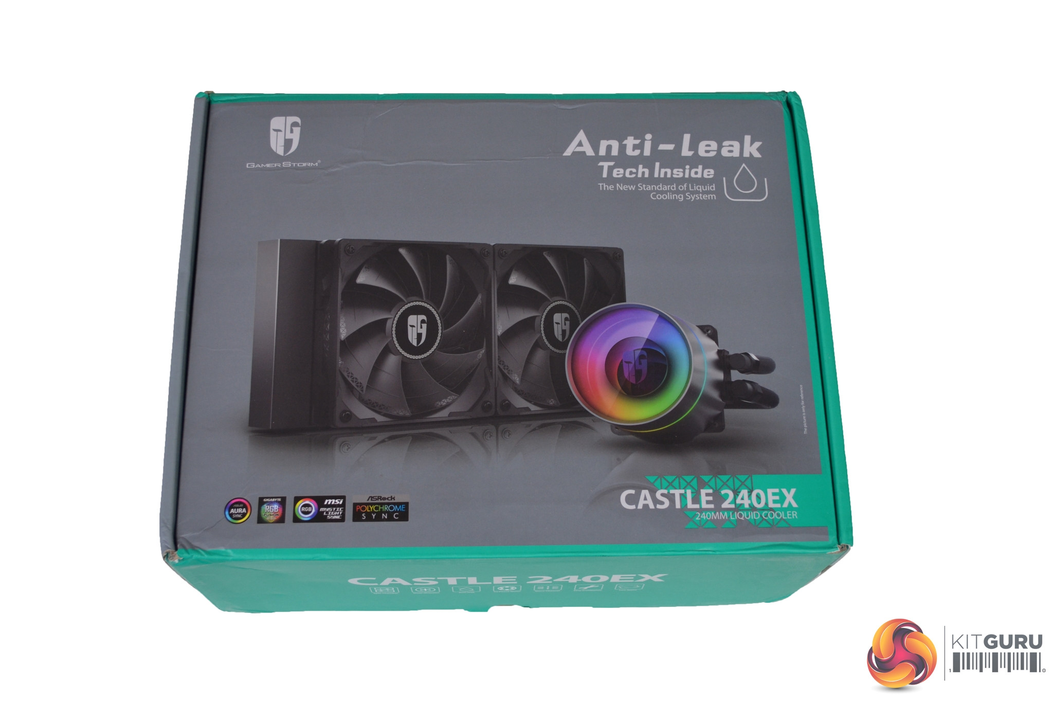 The front of the packaging shows a large image of the cooler in the centre, while the name and reference to the anti-leak technology sits on the right-hand side. A Gamer Storm logo is situated at the top left, bottom left shows compatible motherboard RGB software.