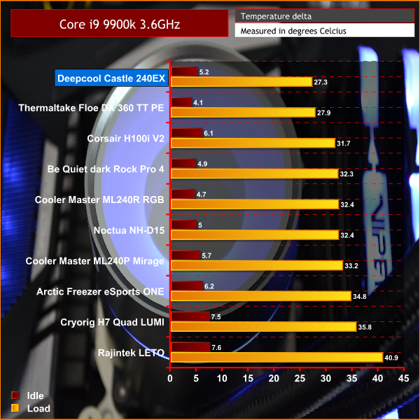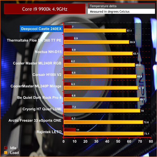 Even more surprising is that the Castle 240EX is still the best performer in our 4.9GHz test. Again beating the Thermaltake by over 2°C and way out in front of any other 240mm AIO on the list. Quite an astonishing achievement.