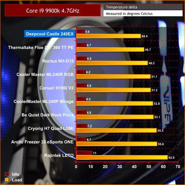 In our initial 4.7GHz overclock test the Castle 240EX holds on to the top spot, with an increased lead over the 360mm Thermaltake both at idle and by over 2°C now under load. These are quite impressive figures for a 240mm All-In-One cooler.