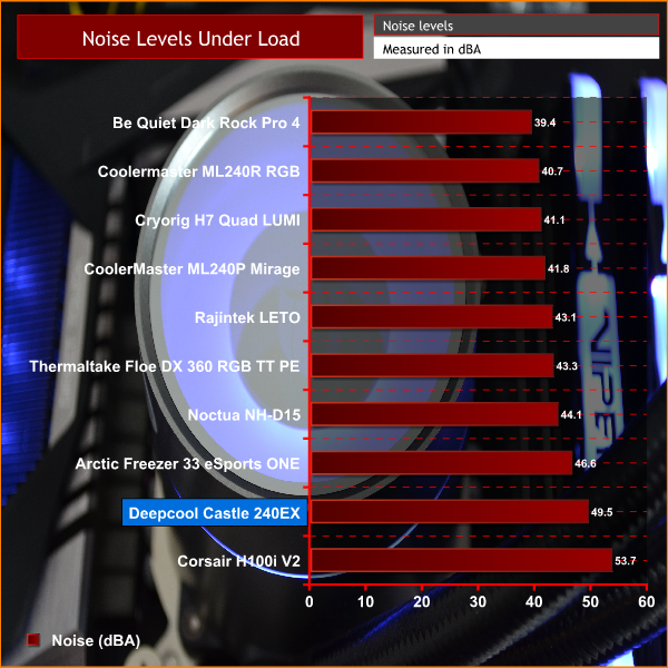 Obviously a factor why the Deepcool Castle 240EX performed so well in the thermal tests, is the fan speed. At 1800 RPM they will move a lot of air over the radiator. However, this does have an effect on how much noise is created by the fans. As we can see from the chart the Deepcool is one of the louder coolers we have tested, generating 49.5 dBA noise level while under load and the fans running at full speed.